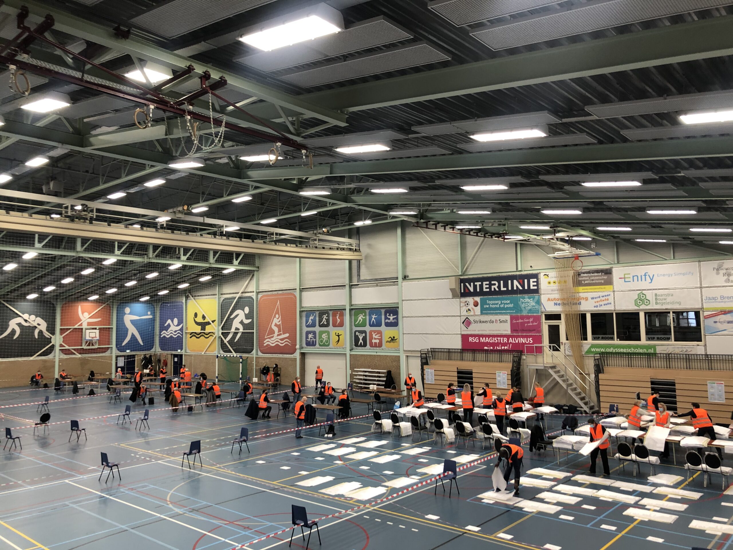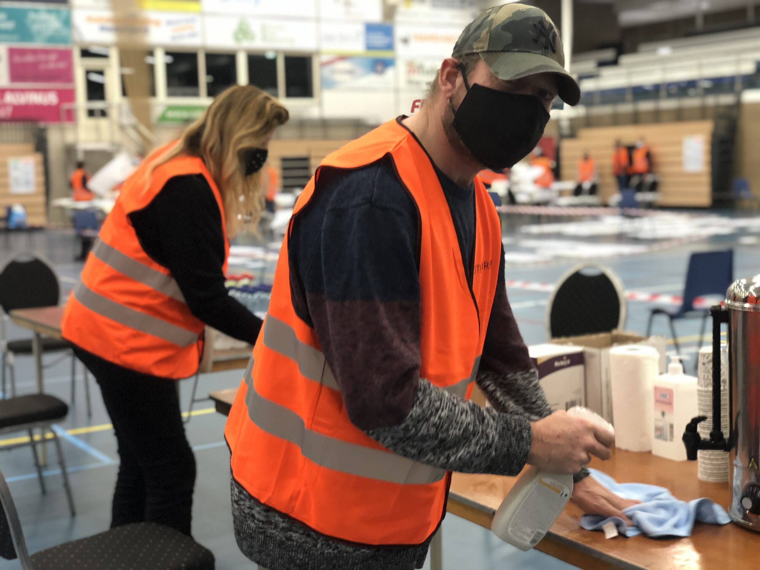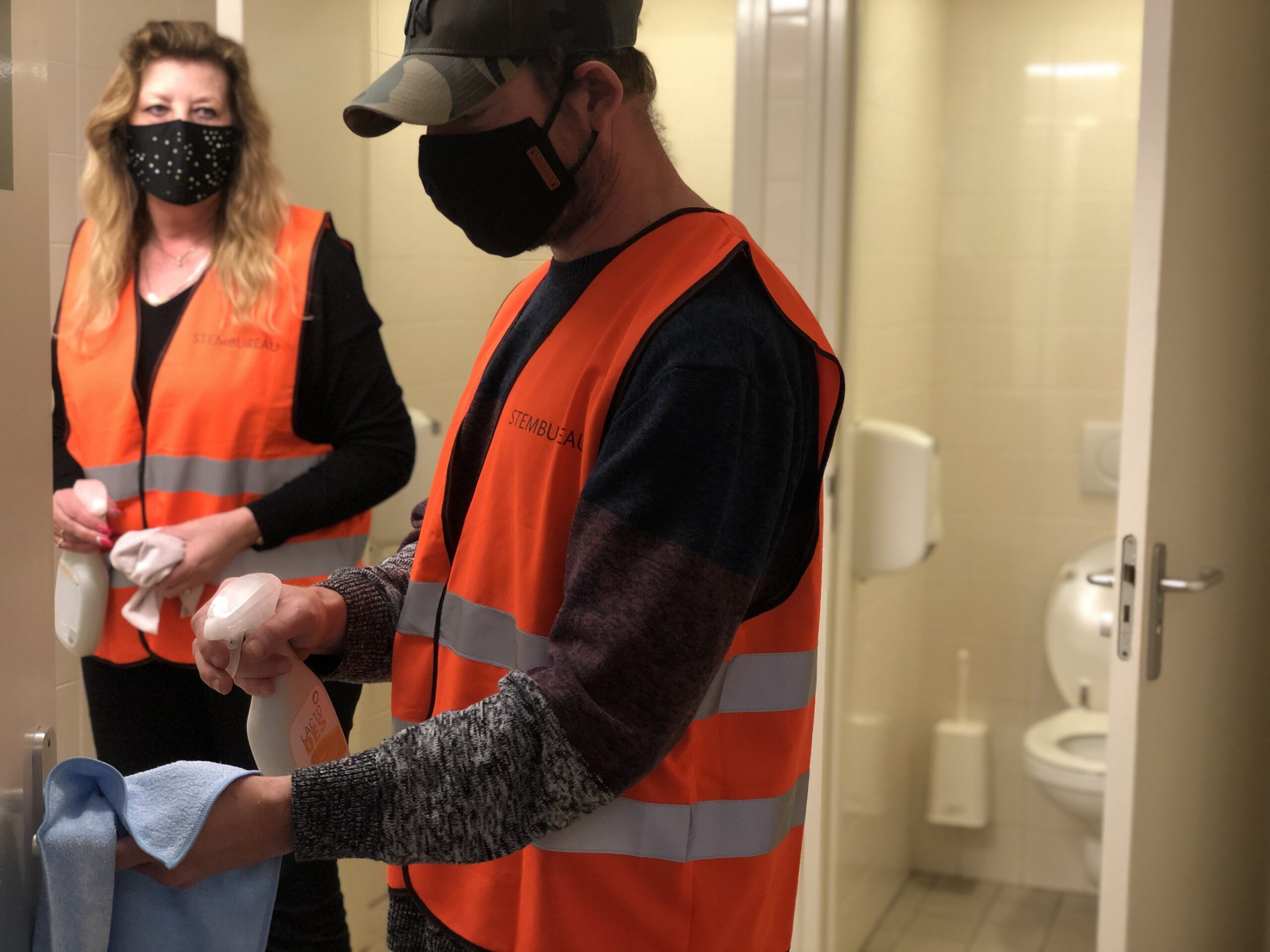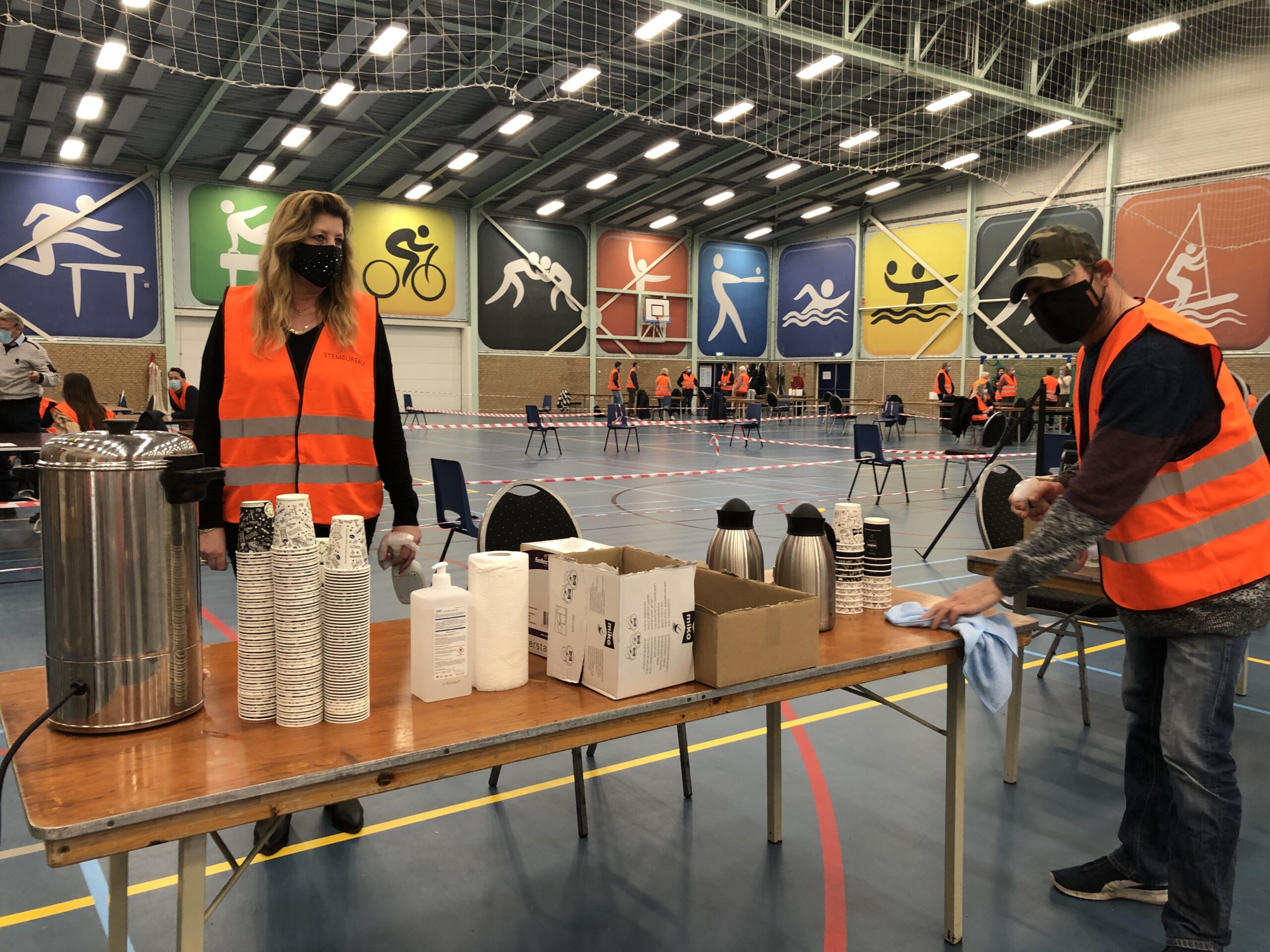 Maar dat is nog niet alles, de stemmen moeten ook geteld worden. In Sneek gebeurt dit momenteel in de Sneker Sporthal. Omdat hier veel verschillende mensen samenkomen is goede hygiëne – juist nu – van extra groot belang. Gemeente Súdwest-Fryslân heeft ons benaderd voor dit mooie schoonmaakproject. Wilma en Douwe, deelnemers van Wurkjouwer, houden de hele dag de locatie schoon. De schoonmakers doen extra rondes langs deurkrukken en maken de toiletten nog vaker schoon dan gebruikelijk.